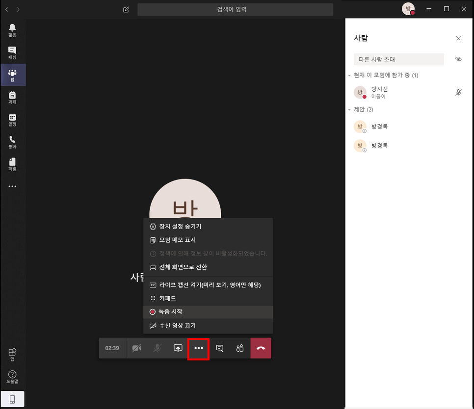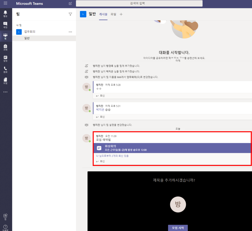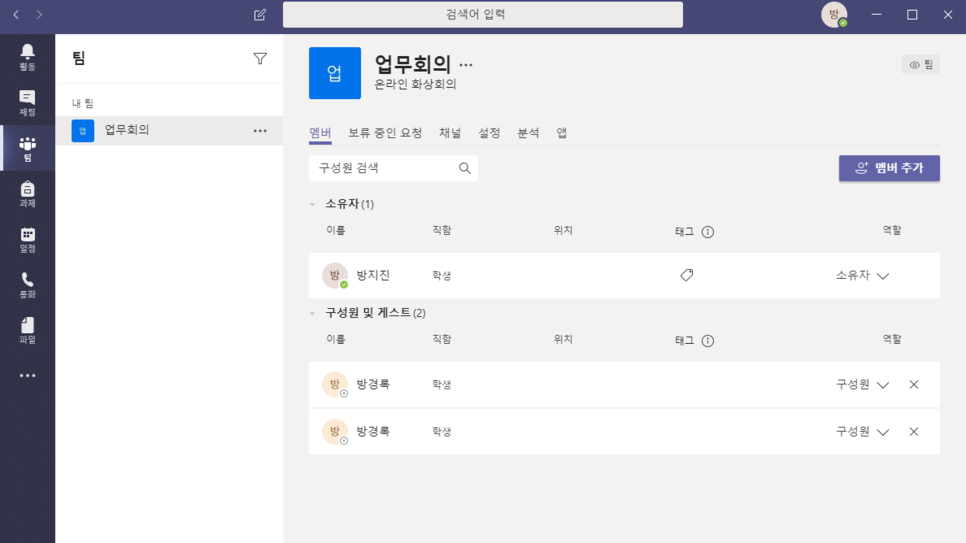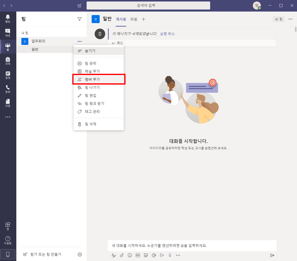 ② 만들어진 팀 내에서 회의에 참여할 멤버를 추가하실 수 있습니다.