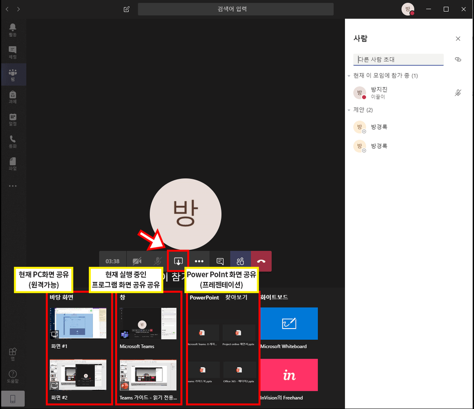 ④공유 버튼을 클릭하면, 데스크톱 공유 및 현재 실행 중인 프로그램도 공유할 수 있습니다.