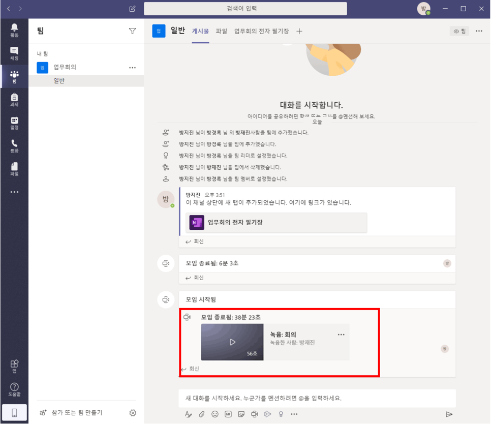 ⑥회의가 종료되면 해당 팀 채팅방에 회의록과 녹화본이 공유 되어 확인할 수 있습니다.