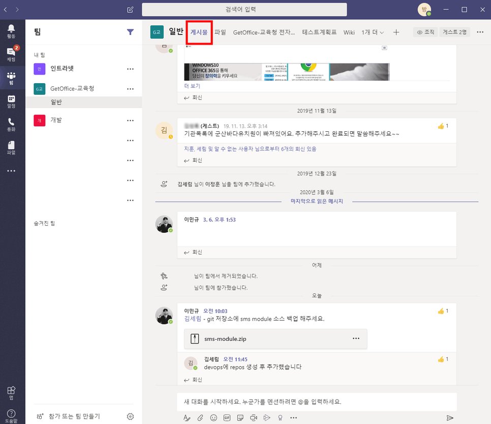 ①팀 [게시물]을 통해 대화 내용을 확인할 수 있습니다.