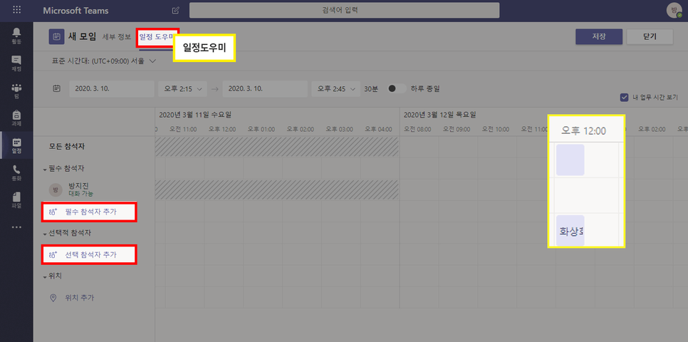 ③[일정 도우미]를 통해 일정을 확인할 수 있으며, 필수 참석자, 선택 참석자 또한 추가를