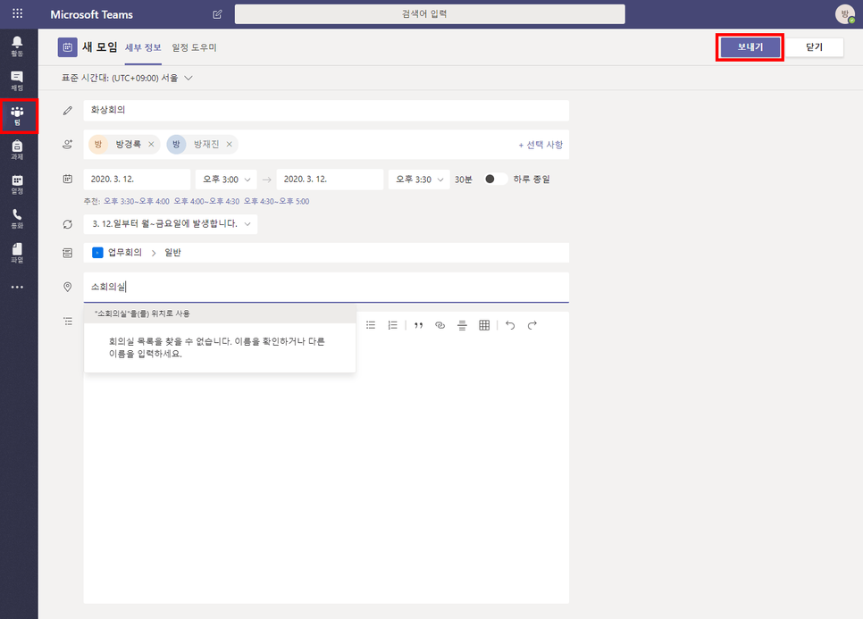 ②일정을 작성했다면, 오른쪽 상단 [보내기] 버튼을 클릭합니다.