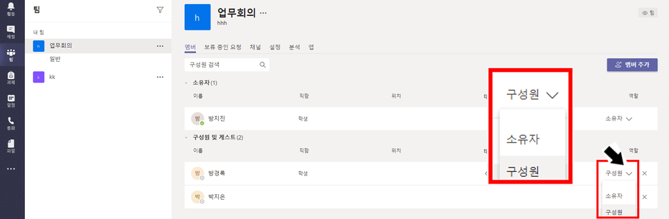 ③팀 관리에서 추가된 팀원들을 확인할 수 있으며, 팀 내 소유자는 [역할]을 통해 구성원들의 역할을 수정하거나 삭제 할 수 있습니다. 수정 및 삭제할 수 있습니다.