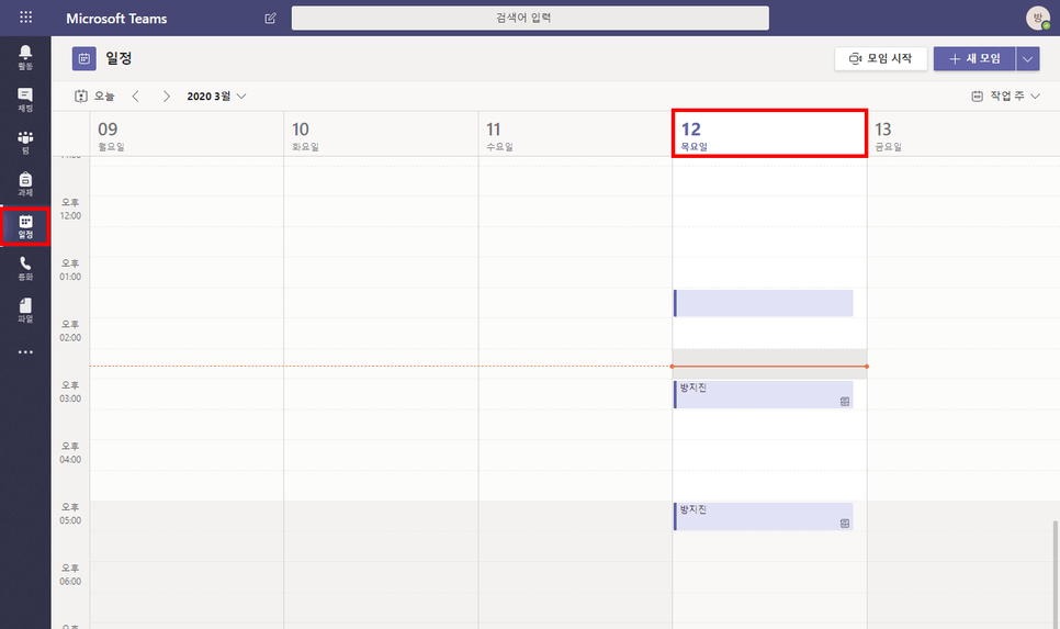 ④예약된 모임 일정은 팀 대화방, 왼쪽 [일정] 메뉴를 통해 확인할 수 있습니다.