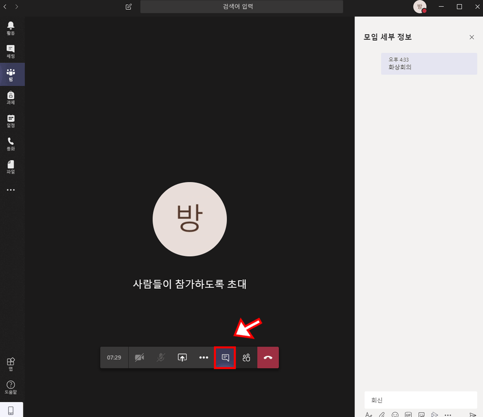 ⑤채팅 버튼을 통해, 회의를 진행하면서 팀 채팅창을 이용할 수 있습니다.