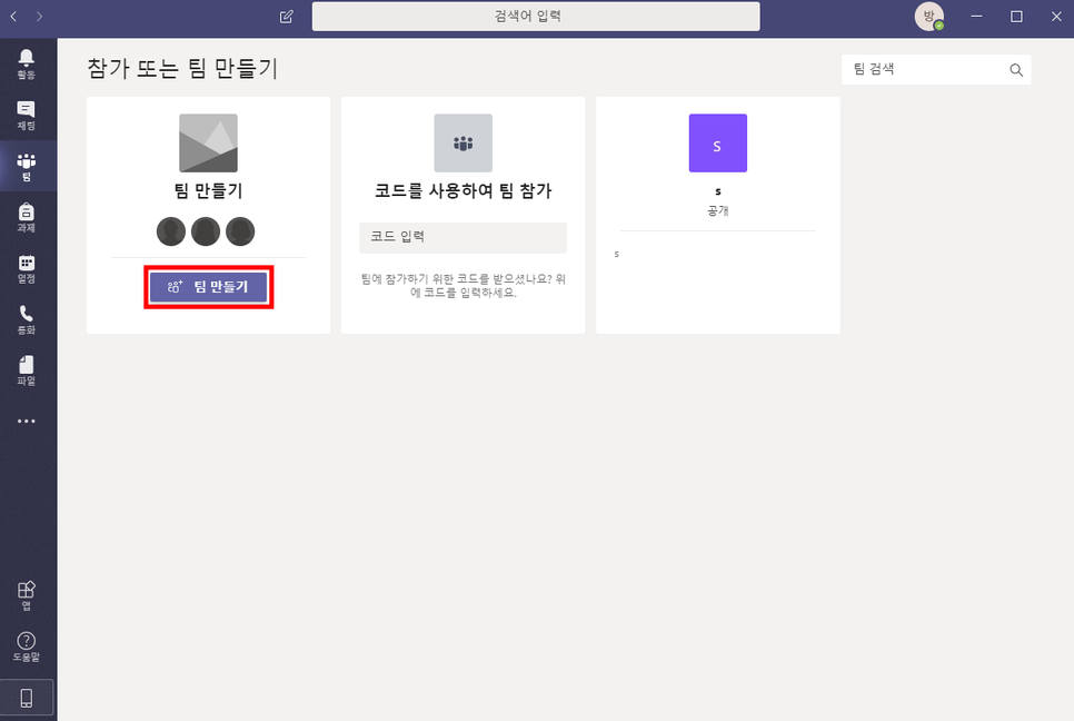 ①팀 개설을 위해 팀 만들기 버튼을 클릭합니다.