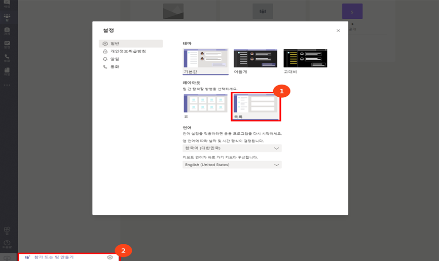 ② 설정 > 일반에서 팀즈 화면의 테마를 변경할 수 있으며, (1) 목록 레이아웃을 클릭하면 왼쪽 하단에 (2) [참가 또는 만들기] 버튼이 생성됩니다.