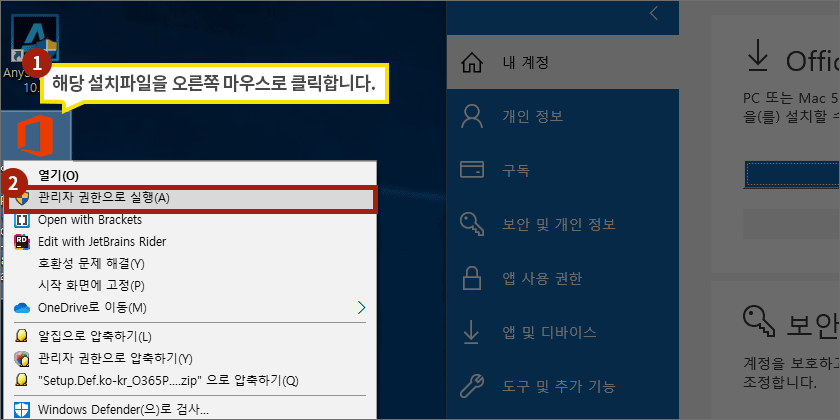 ③ 바탕화면으로 옮긴 후, 설치파일 관리자 권한으로 실행 ( 설치 파일 > 오른쪽 마우스를 클릭 > 관리자 권한으로 실행 )