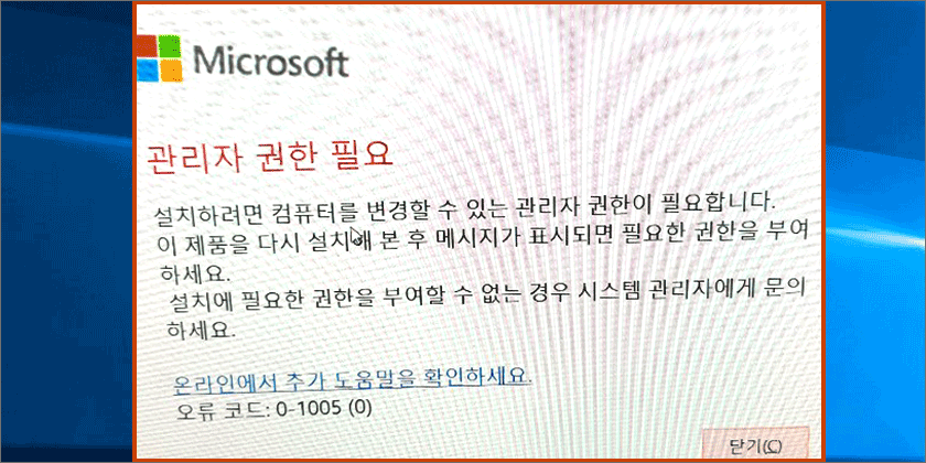 Office365 설치 시 "관리자 권한 필요" 오류 메시지가 출력되면서 설치가 되지 않는 경우가 있습니다.