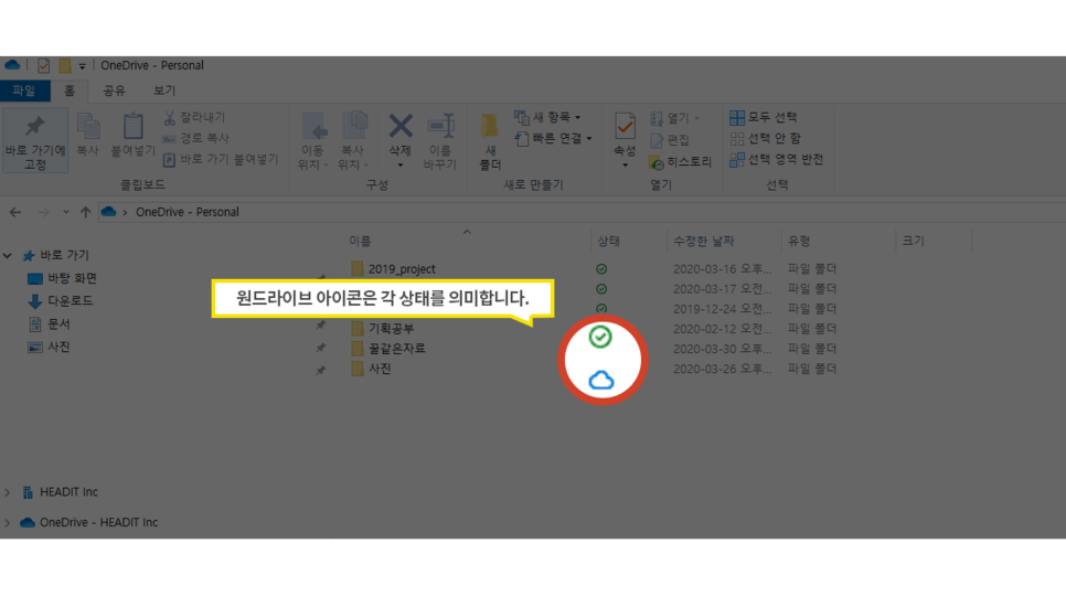 원 드라이브(OneDrive)와 동기화되어 있는 폴더들은 여러 모양의 아이콘이 표시가 되어있습니다.