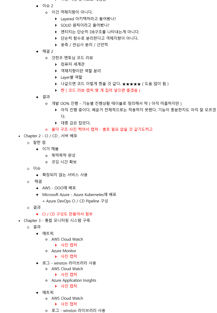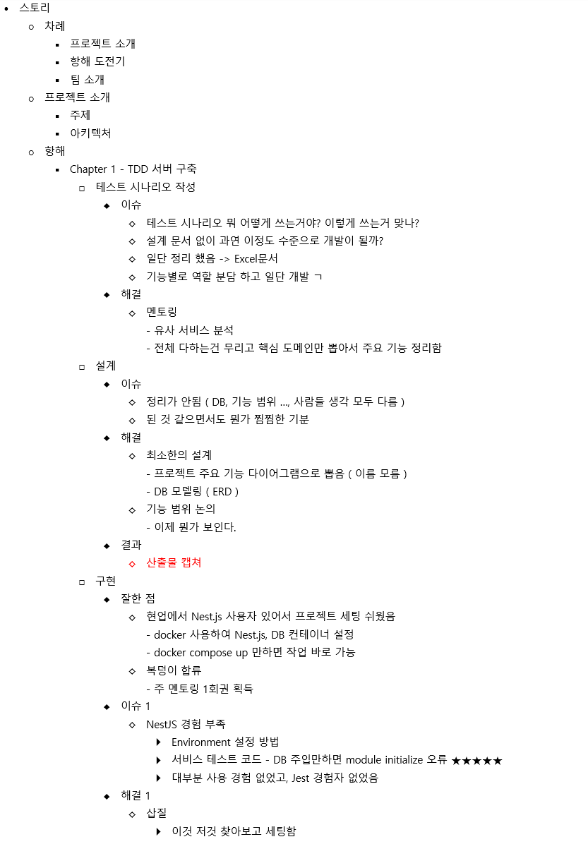 기술적인 도전 및 트러블 슈팅은 과정 중에 있었던 큰 이슈들만 정리해서 넣을지 아니면 시간 순서대로 넣을지 고민이 됐었는데, 챕터별로 우리가 겪었던 일들을 순서대로 전달하는게 좋을 것 같았다. 챕터별로 이슈, 이슈를 해결하기 무엇을 했는지, 결과물 순서로 구성하고 내용을 정리하고 팀원분들께 의견을 전달했다.