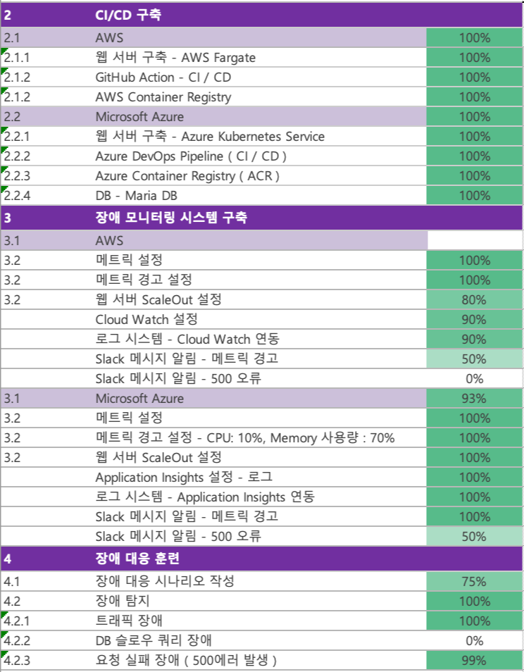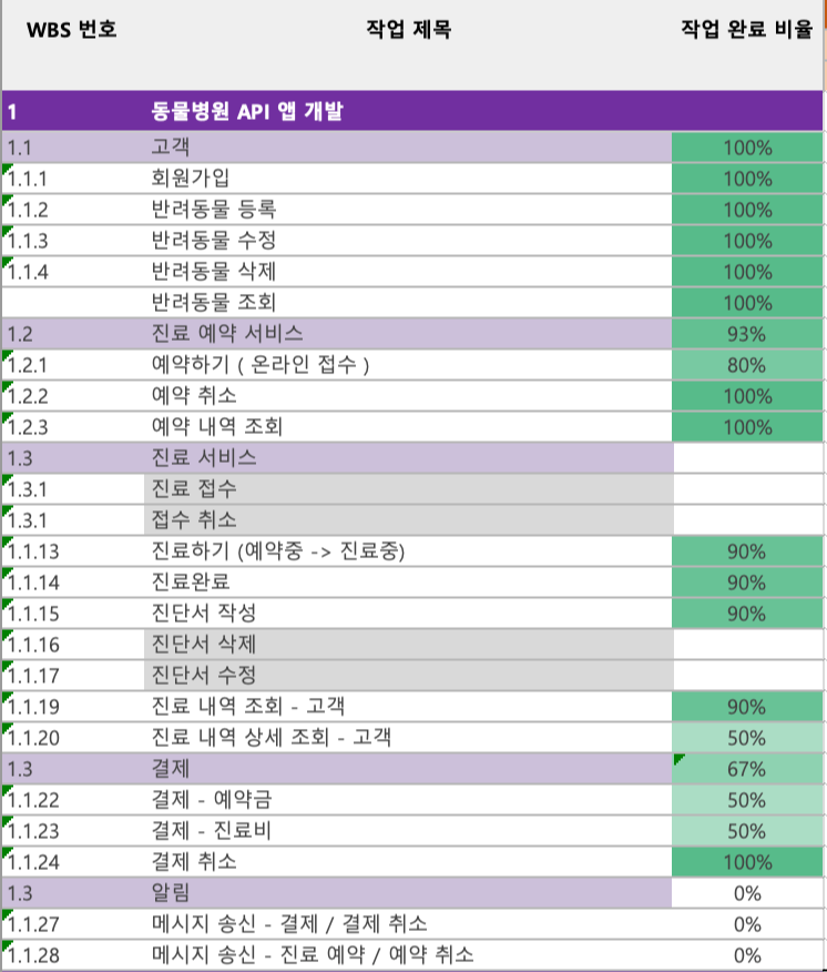 우리 조는 할일이나 진행상황을 따로 문서화하지 않았다. 그렇다보니 정확한 진행상황을 확인하기 어려웠다. 우리가 빼먹은 부분은 없었는지 다시 확인할 겸 발제자료를 다시 보면서 할 일을 정리하고, 결과물을 확인하고 무엇을 못했는지 정리했다. 문서 양식은 회사 WBS 양식을 사용했다. 항상 후회되는 일이지만 진작 했었더라면...
